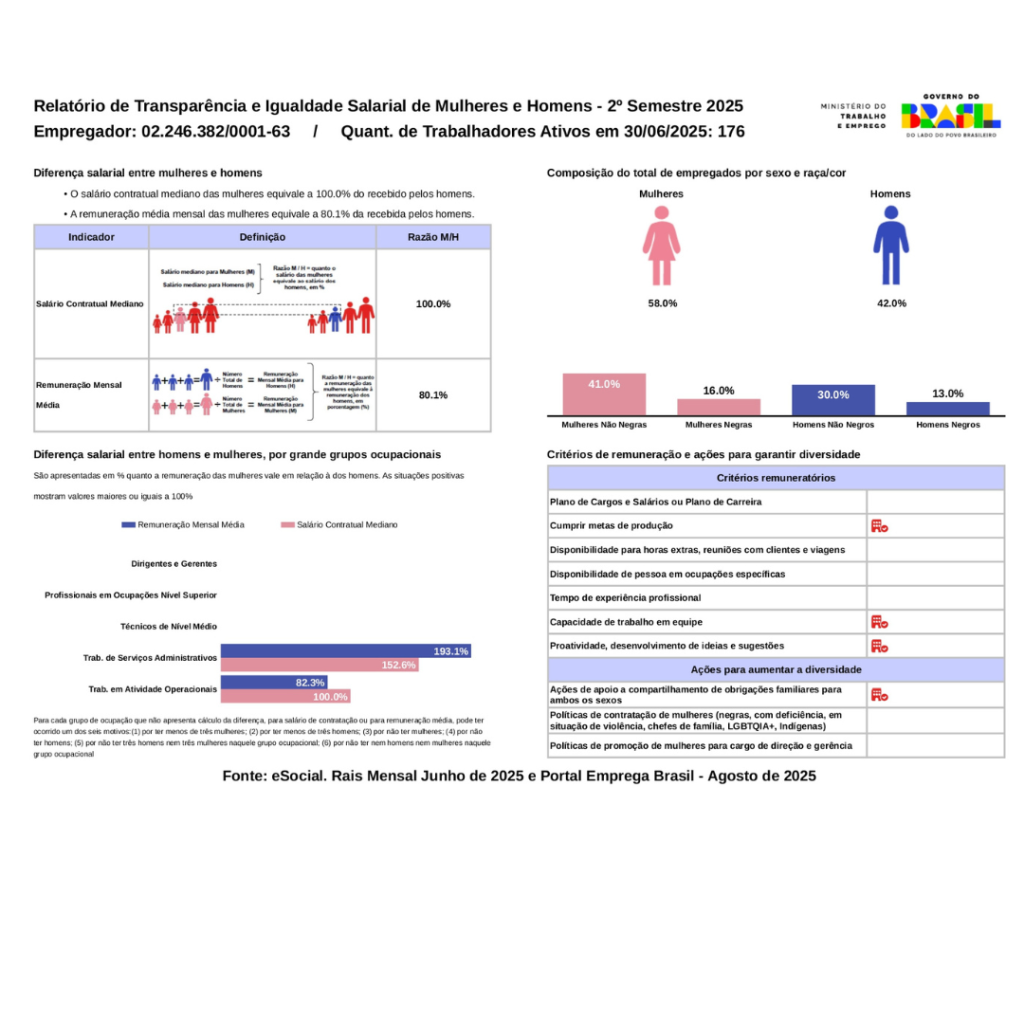 Conforme determinação do Ministério do Trabalho e Emprego (MTE), divulgamos o Relatório de Transparência Salarial, elaborado e disponibilizado pelo próprio MTE, em cumprimento da Lei nº 14.577/23 e da Portaria nº 3.714/23.