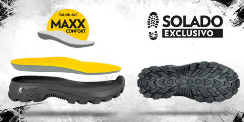 Solado exclusivo Palmilhado Boots composto em borracha/EVA tratorado, anatômico, leve e duradouro. Palmilha de conforto anatômica com sistema regular fit para melhor distribuição do peso e conforto do caminhar